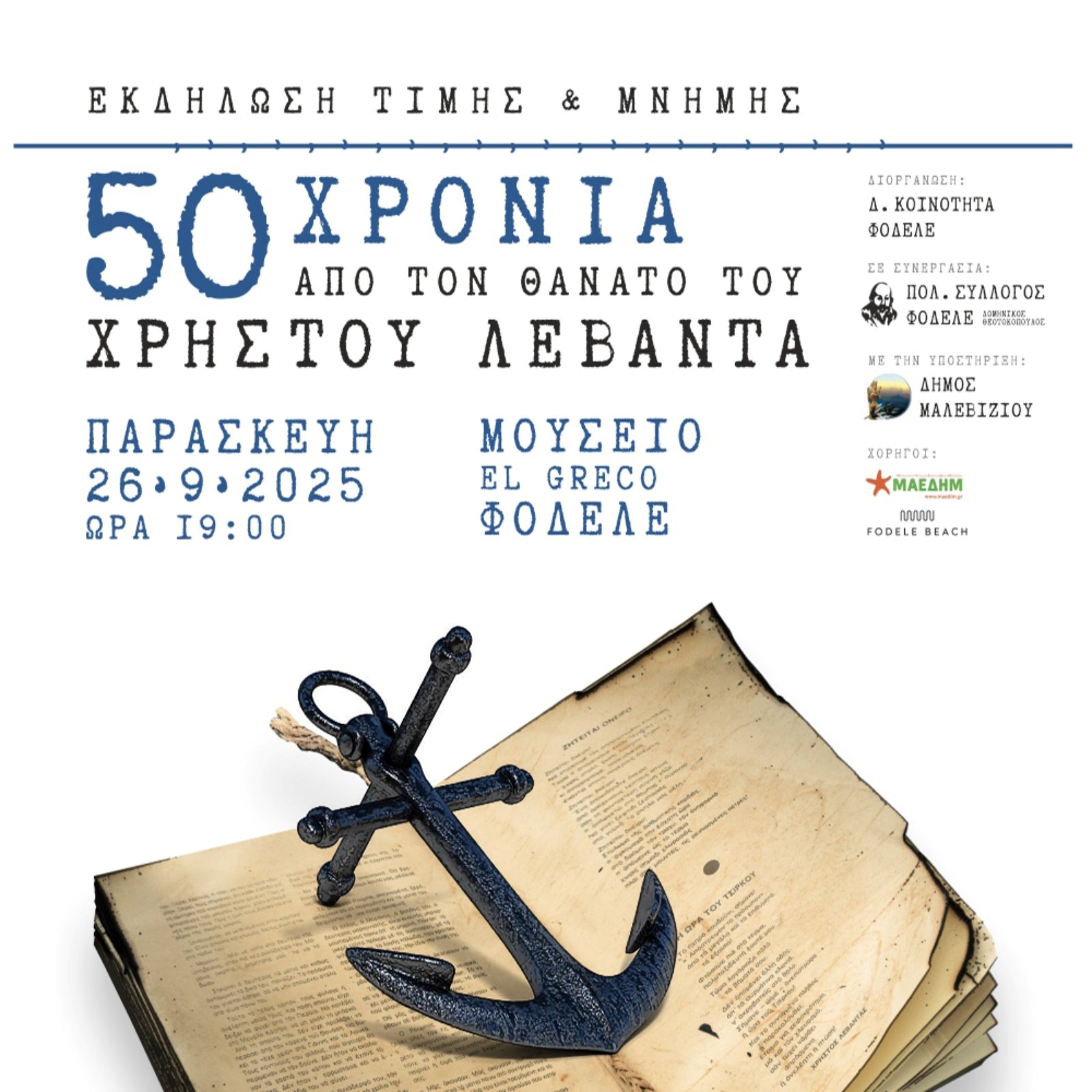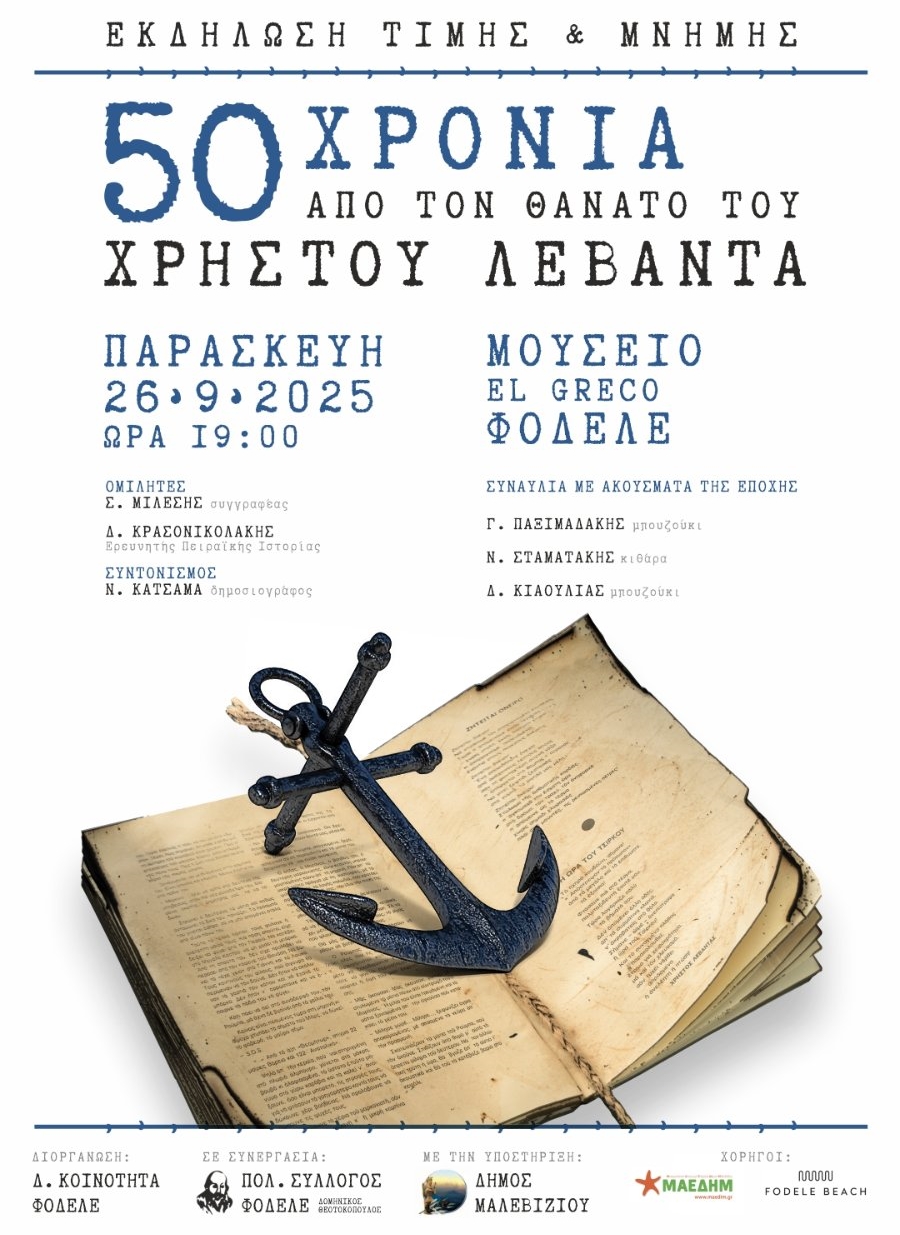 Την ερχόμενη Παρασκευή 26 Σεπτεμβρίου ο Δήμος Μαλεβιζίου, η η Τοπική Κοινότητα Φόδελε και ο Πολιτιστικός Σύλλογος Φόδελε θα τιμήσουν τη μνήμη του συγγραφέα – δημοσιογράφου και δωρητή από το Φόδελε Χρήστου Λεβάντα (κατά κόσμον Κυριάκου Χατζιδάκι), με αφορμή τη συμπλήρωση 50 χρόνων από το θάνατο του.